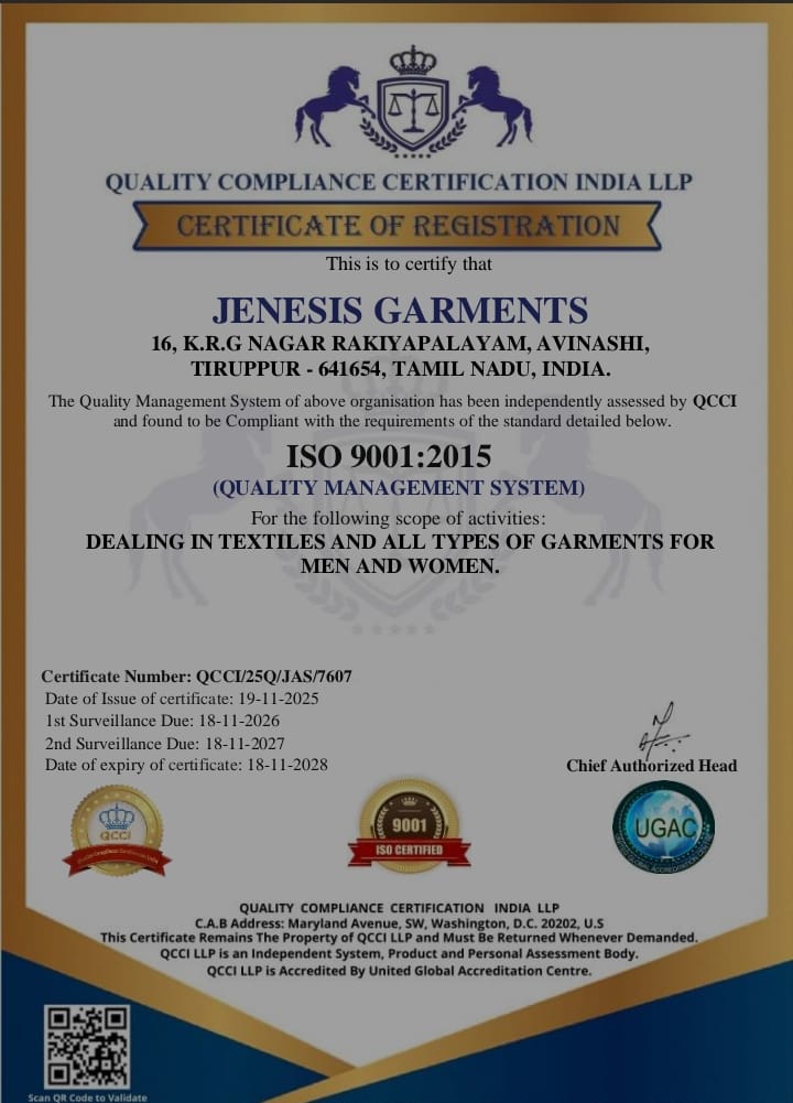 Jenesis Garments operates its manufacturing and production setup from its base in Tirupur, Tamil Nadu — one of India’s major textile and knitwear hubs. While specific details about the exact size or machinery of their facility aren’t published on their official site, the company functions as a garment manufacturing unit where apparel products for men, women, and children are cut, sewn, and finished before distribution.